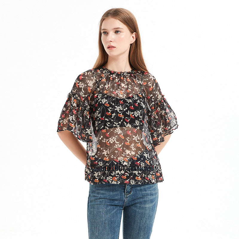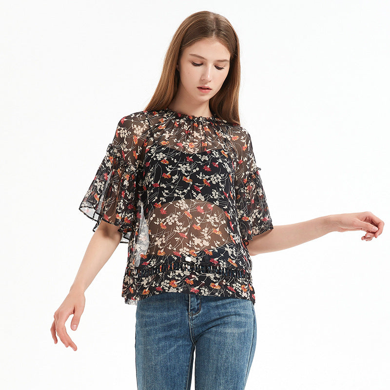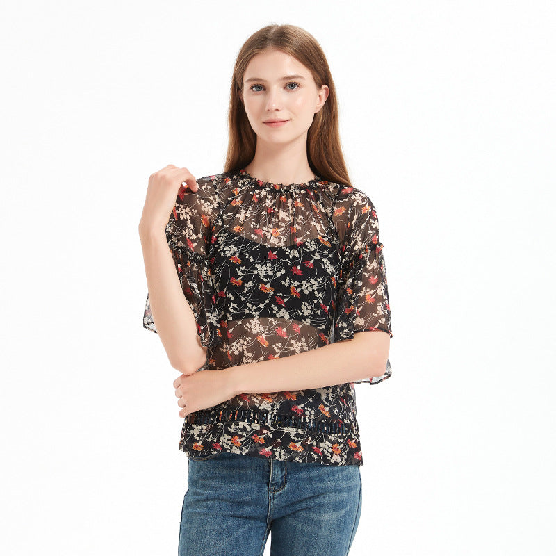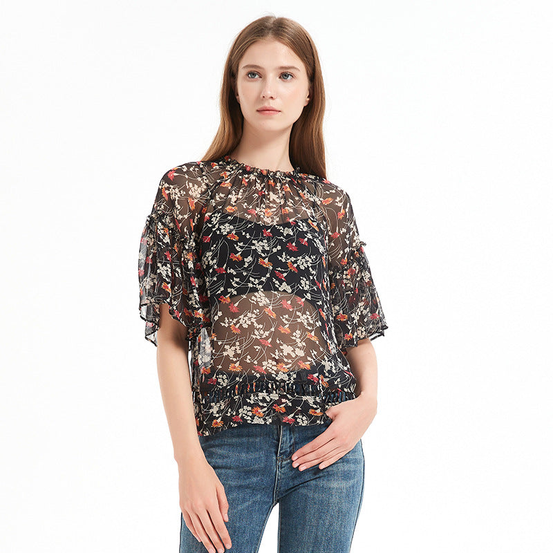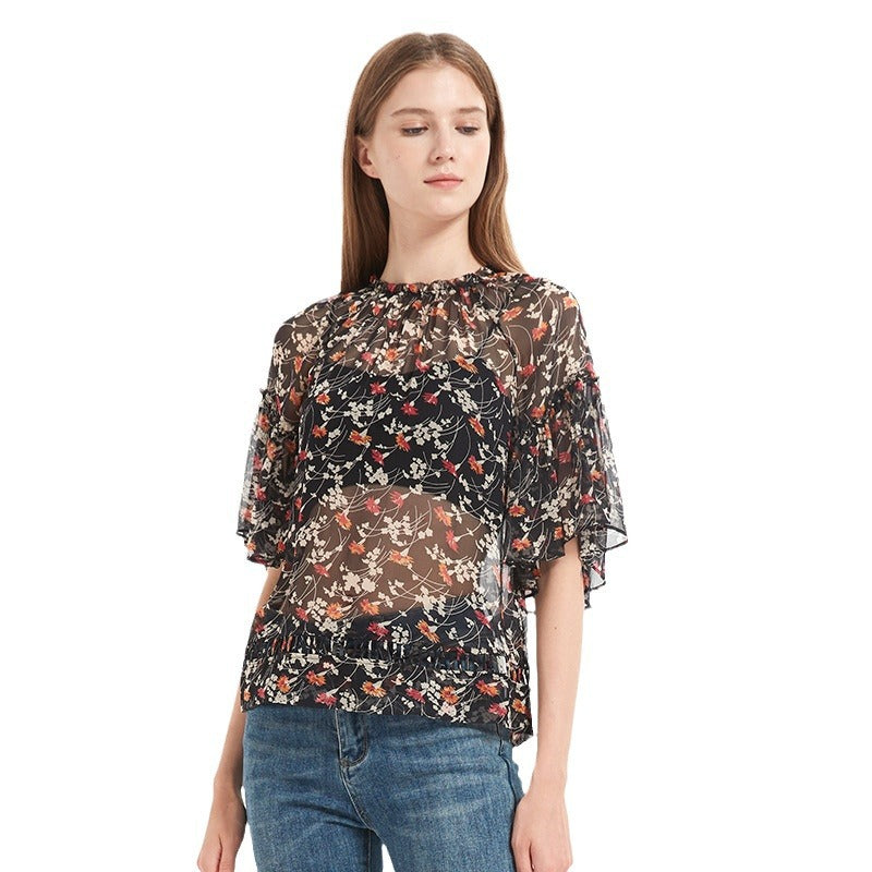 Summer printed silk blouse for women, mulberry silk short-sleeved loose chiffon ruffled top with floral print
